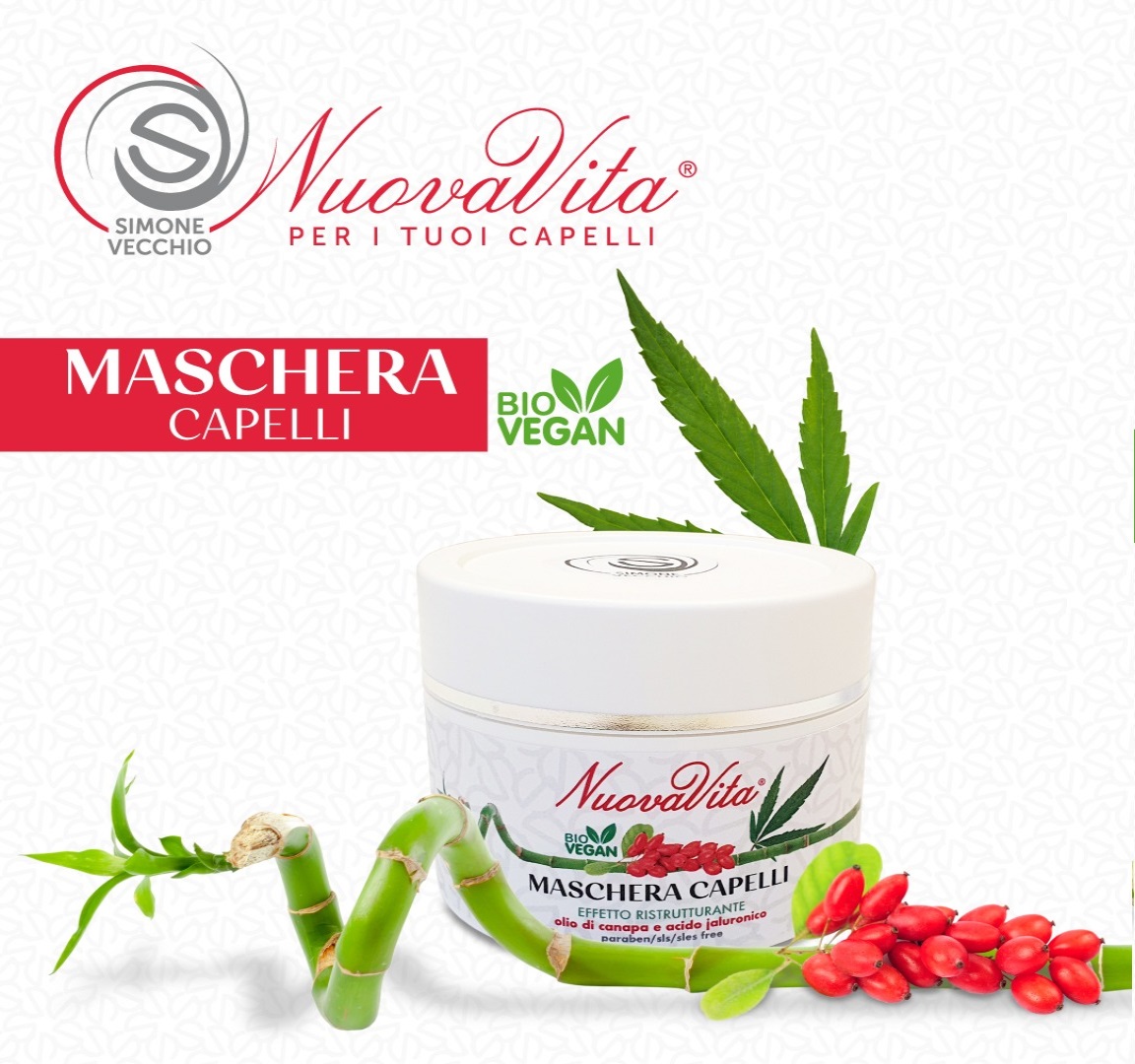 Maschera capelli a base di olio acido ialuronico, idratante e nutriente a base vegetale.